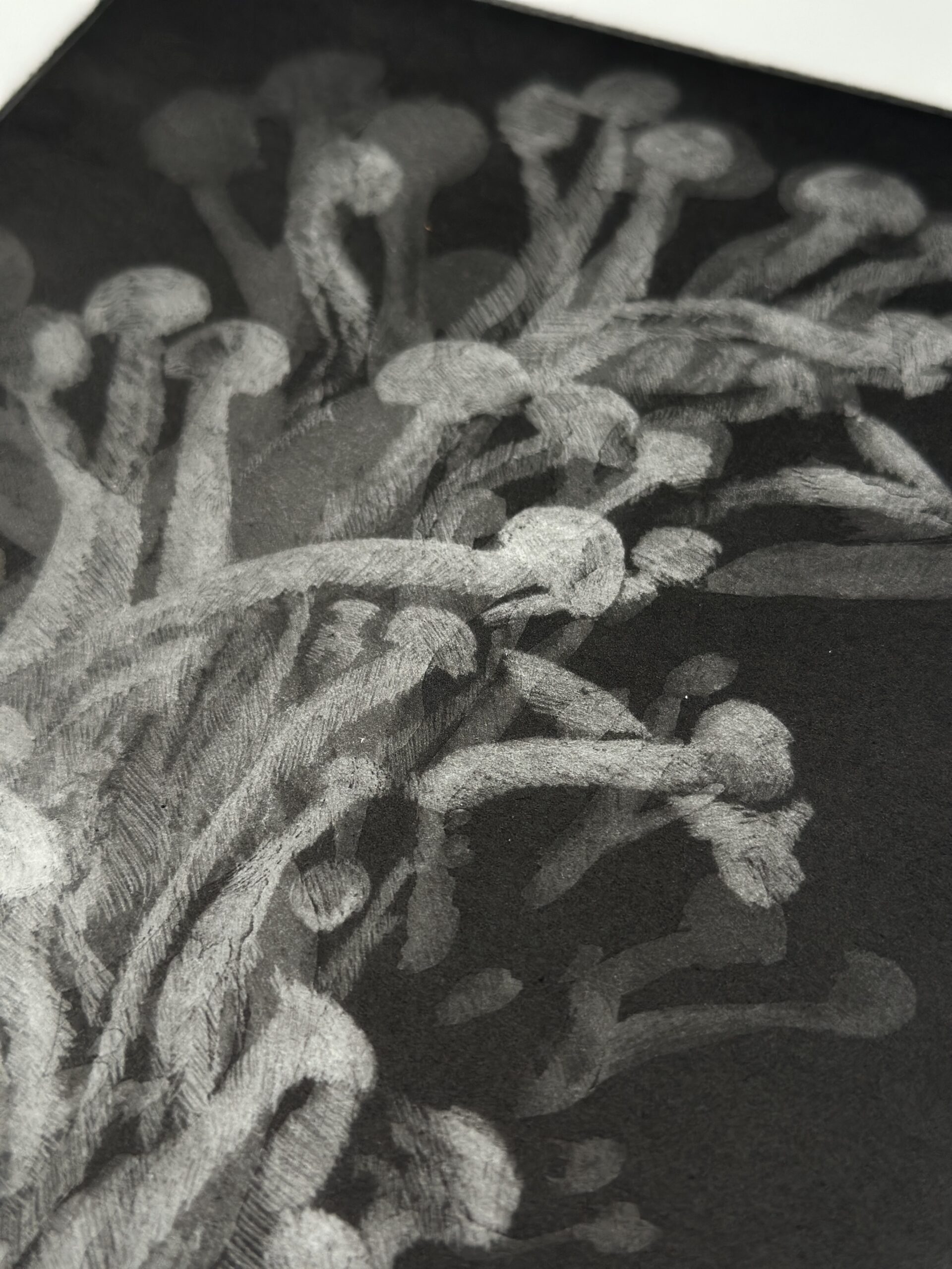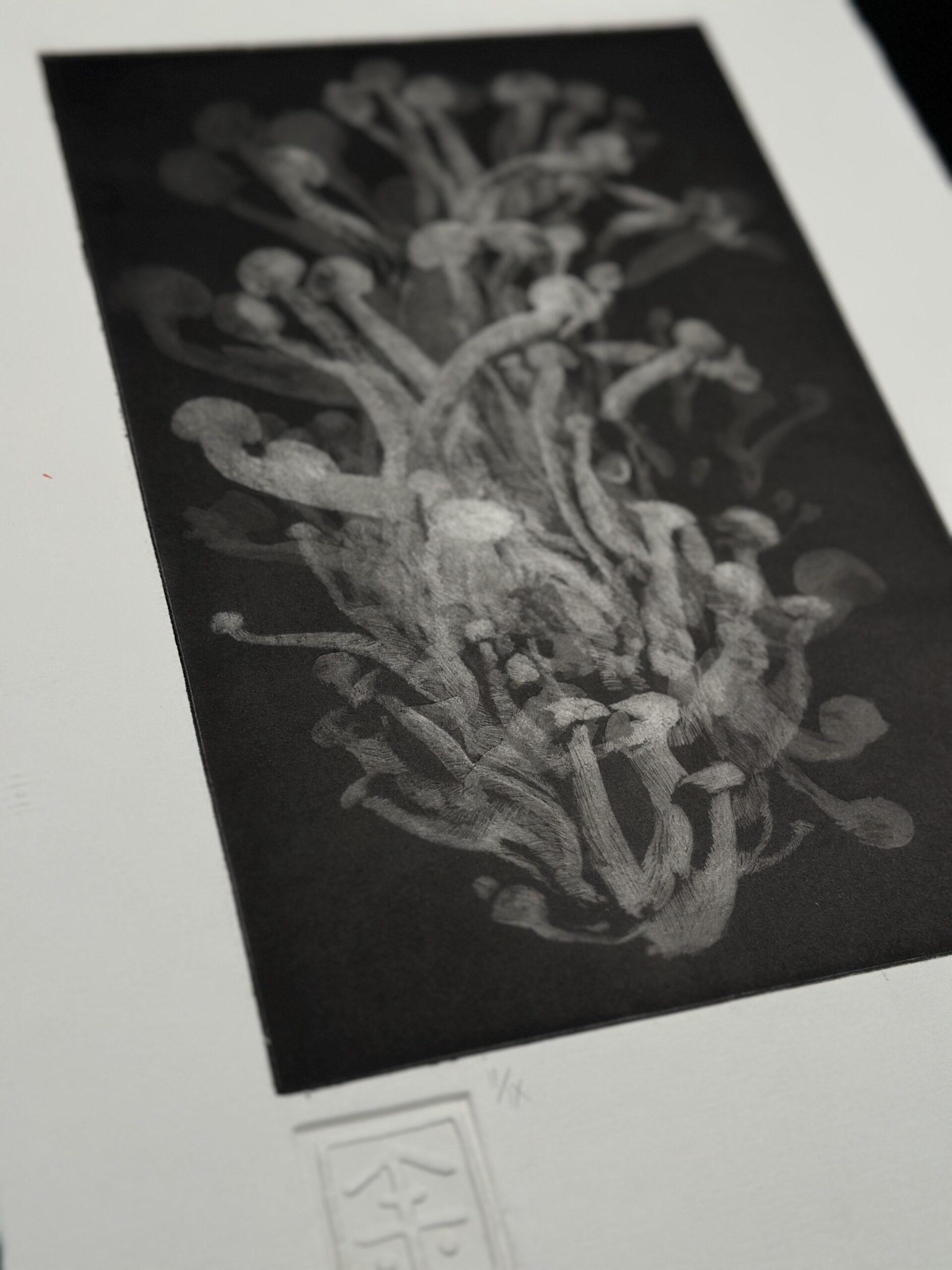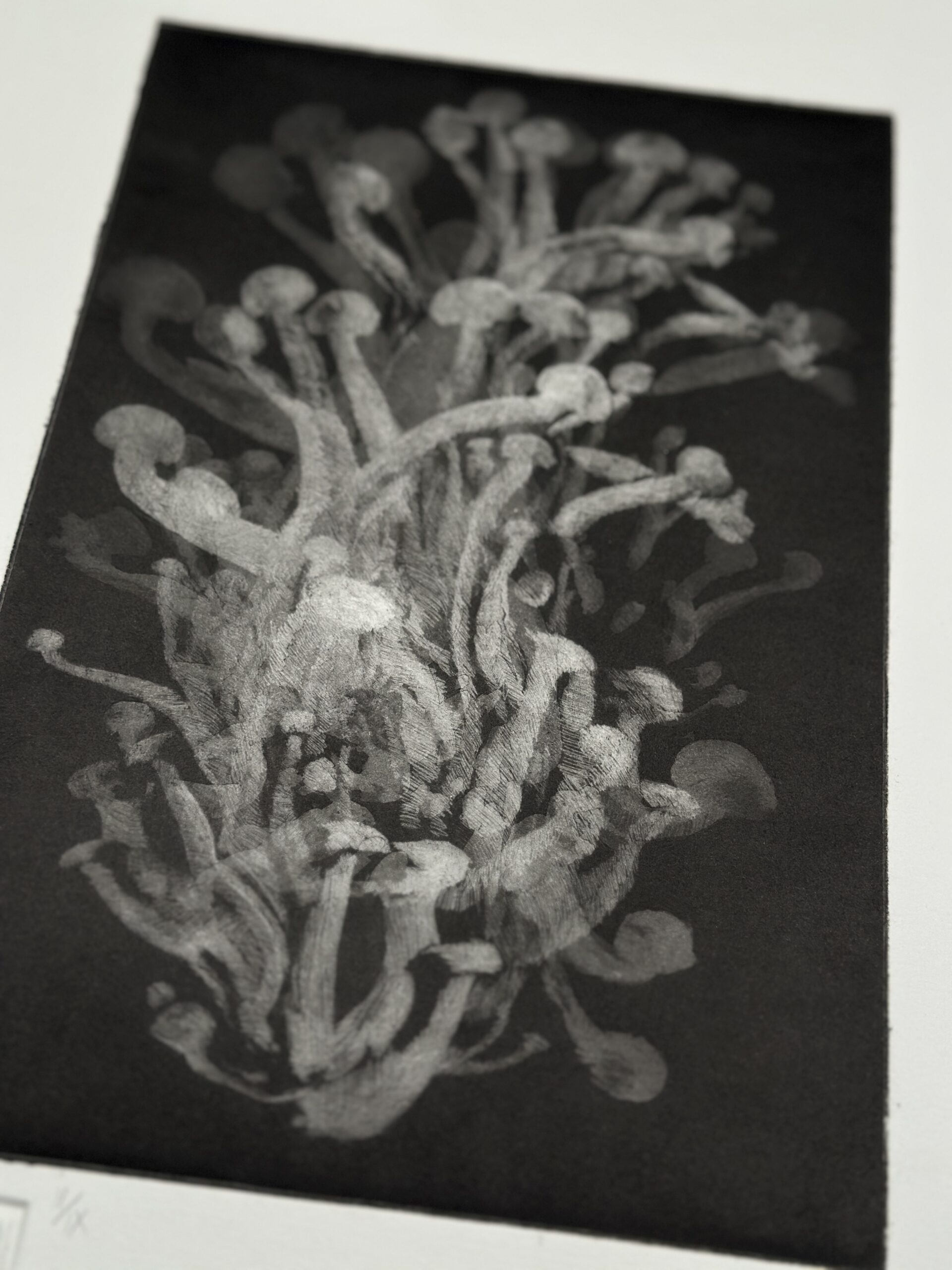 Mezzotinta realizada con resinadora y sucesivas superposiciones de mordidas. La pieza representa una forma micológica elemental, captada en un momento de incipiente bioluminiscencia.