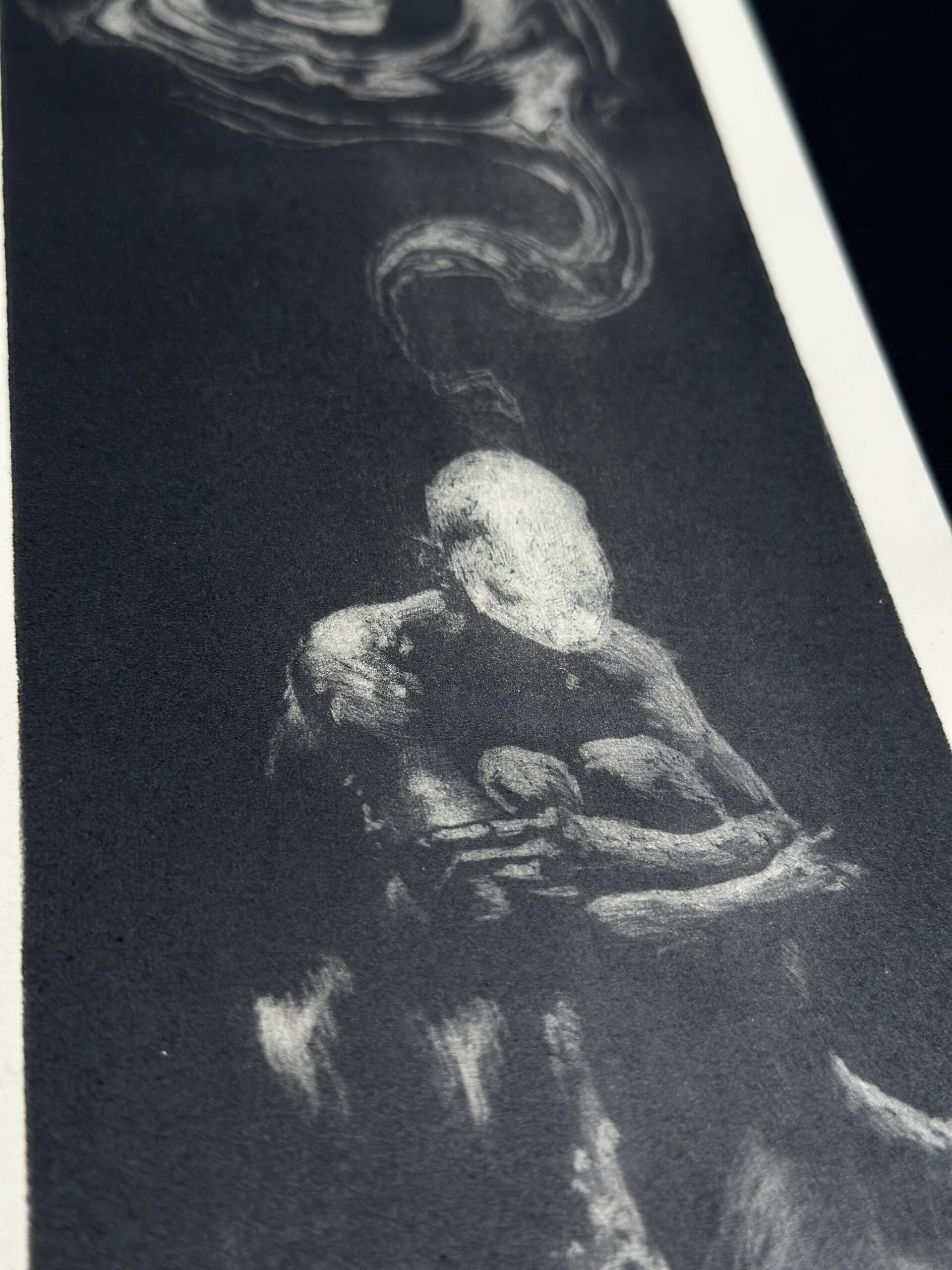 Mezzotinta realizada con resinadora, donde la figura del pensador se enfrenta al vacío, detenida en el umbral del abismo.