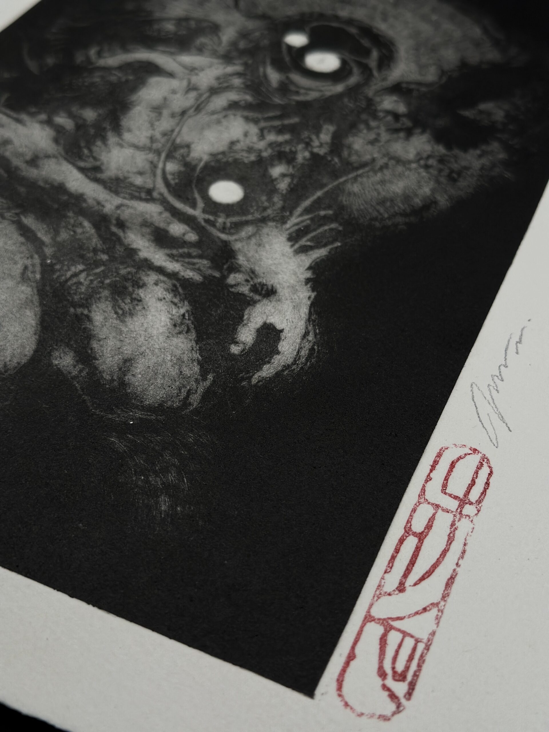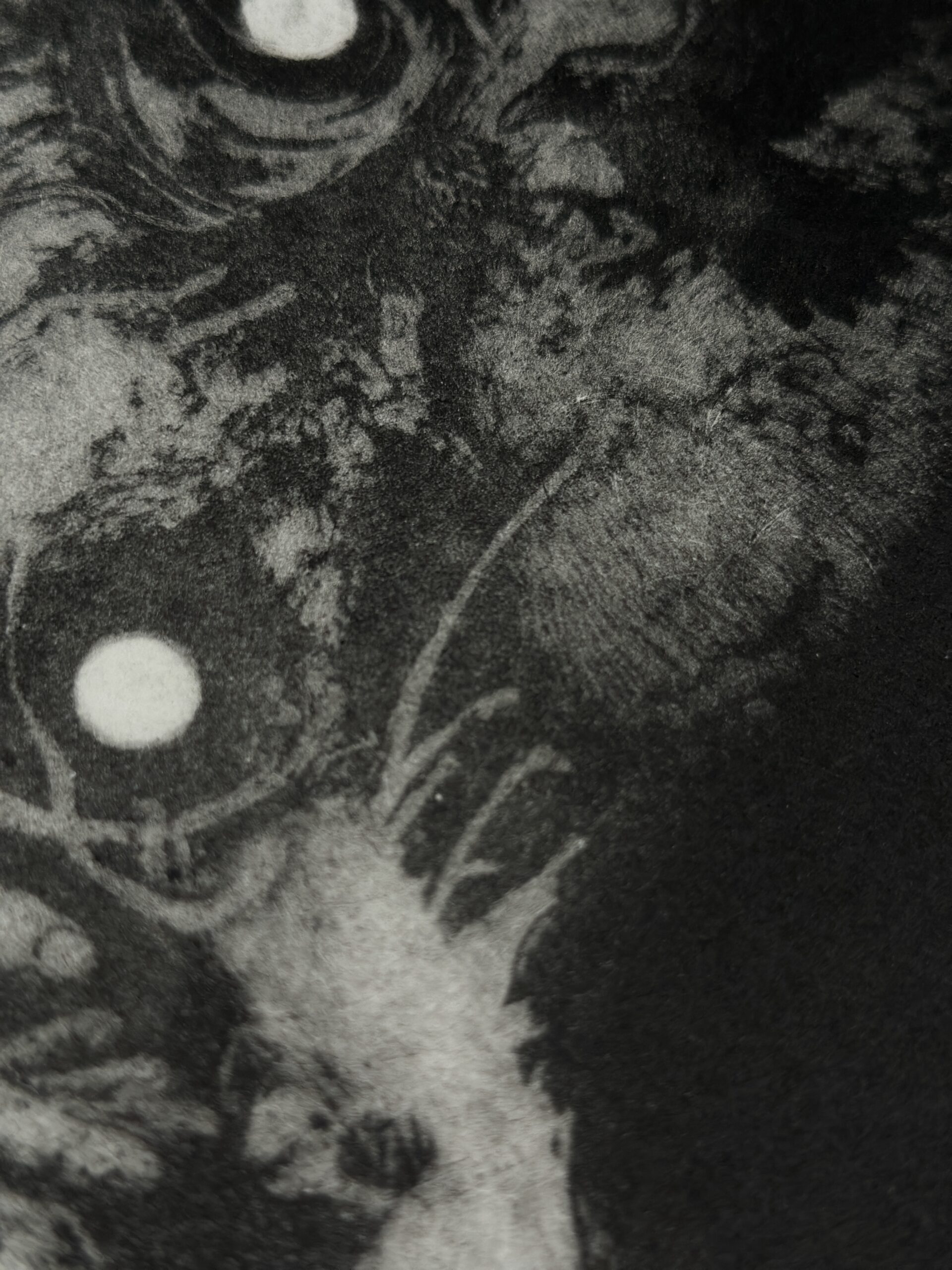 Grabado en mezzotinta realizado mediante resinadora. La obra representa a una sibila de la memoria, criatura encargada de preservar los hilos del pensamiento y del recuerdo.