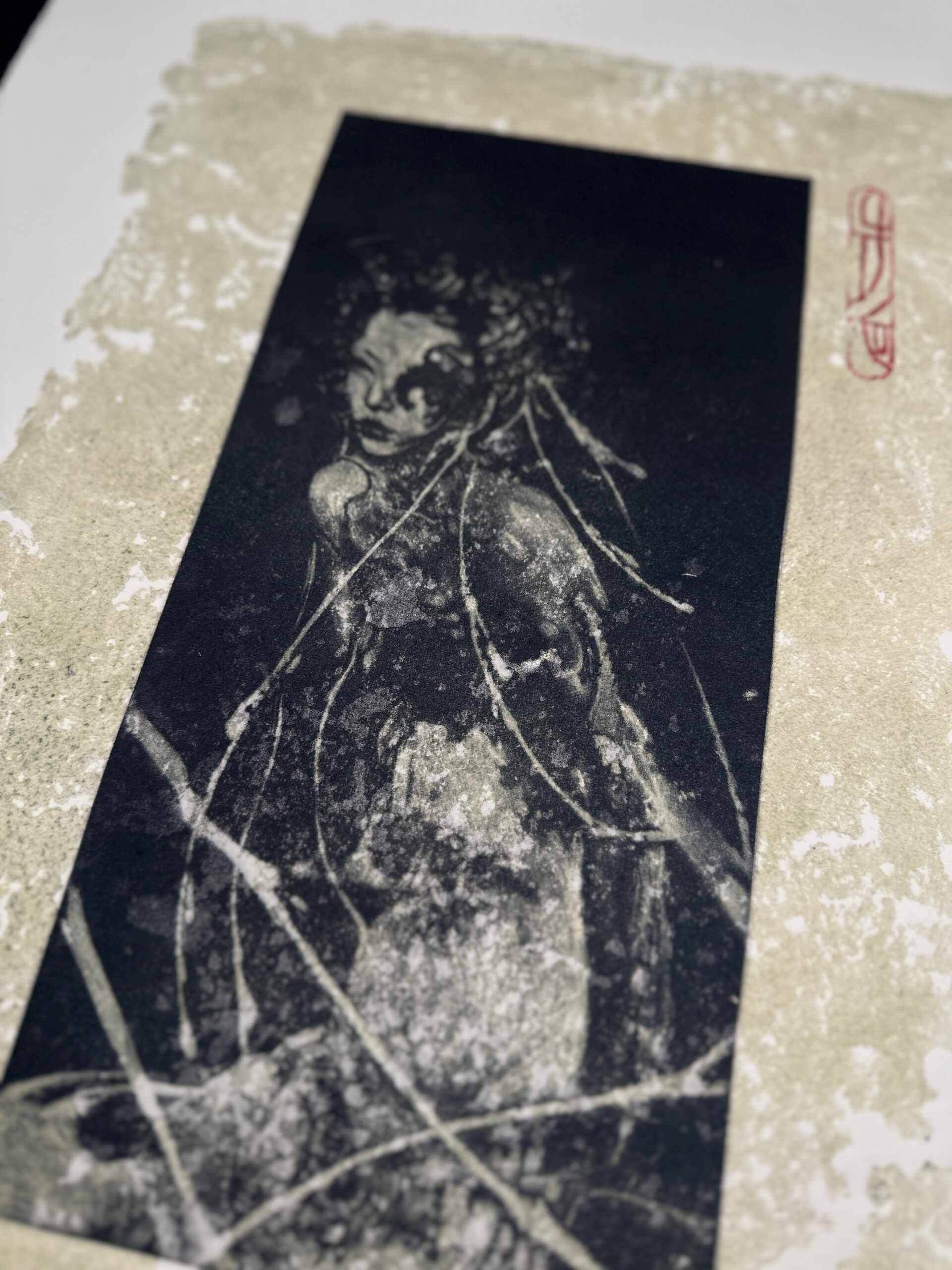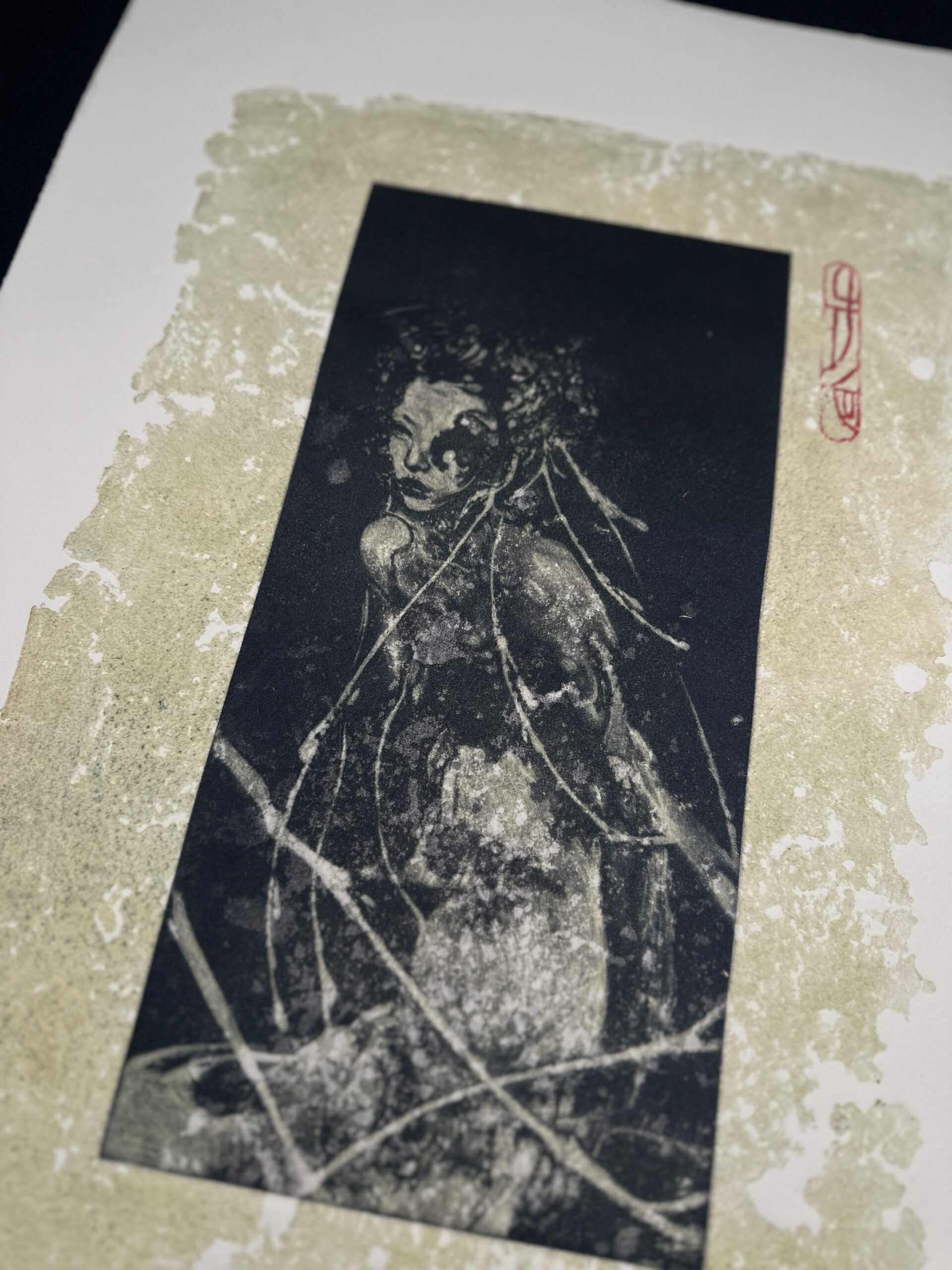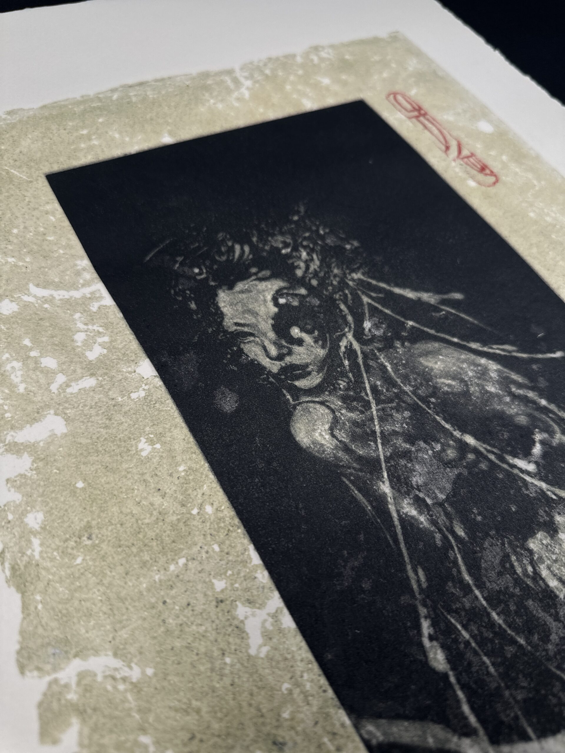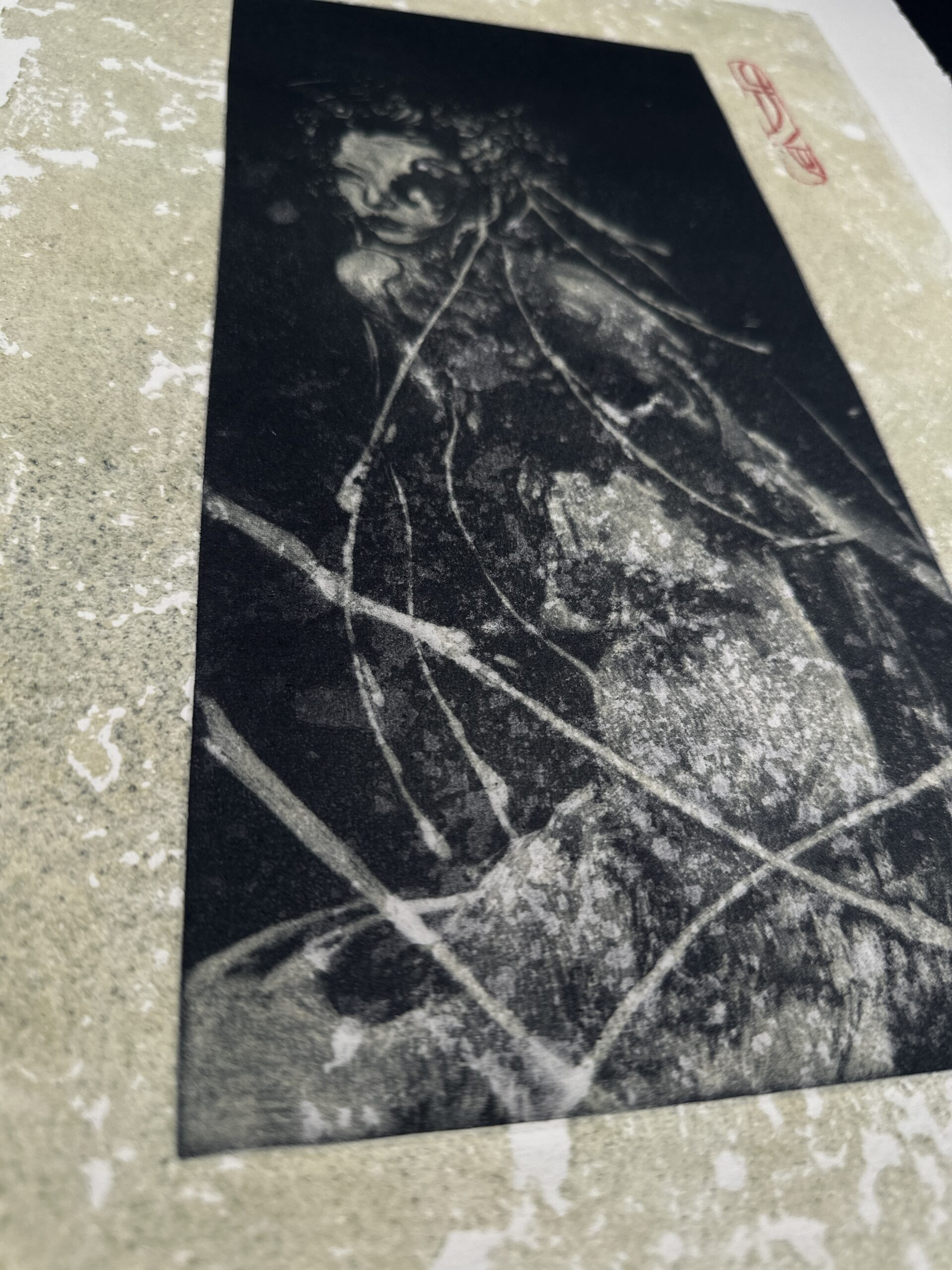 Grabado en mezzotinta realizado mediante graneador estampado encima de una plancha de hierro oxidado, sibilas en movimiento.